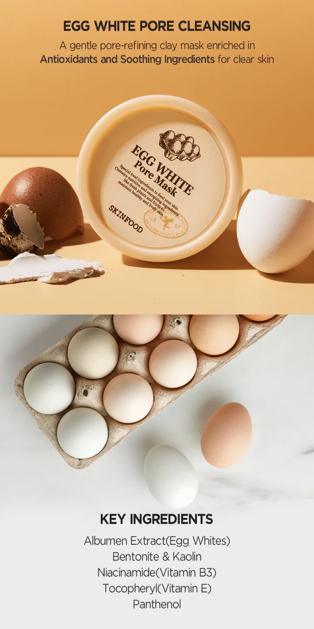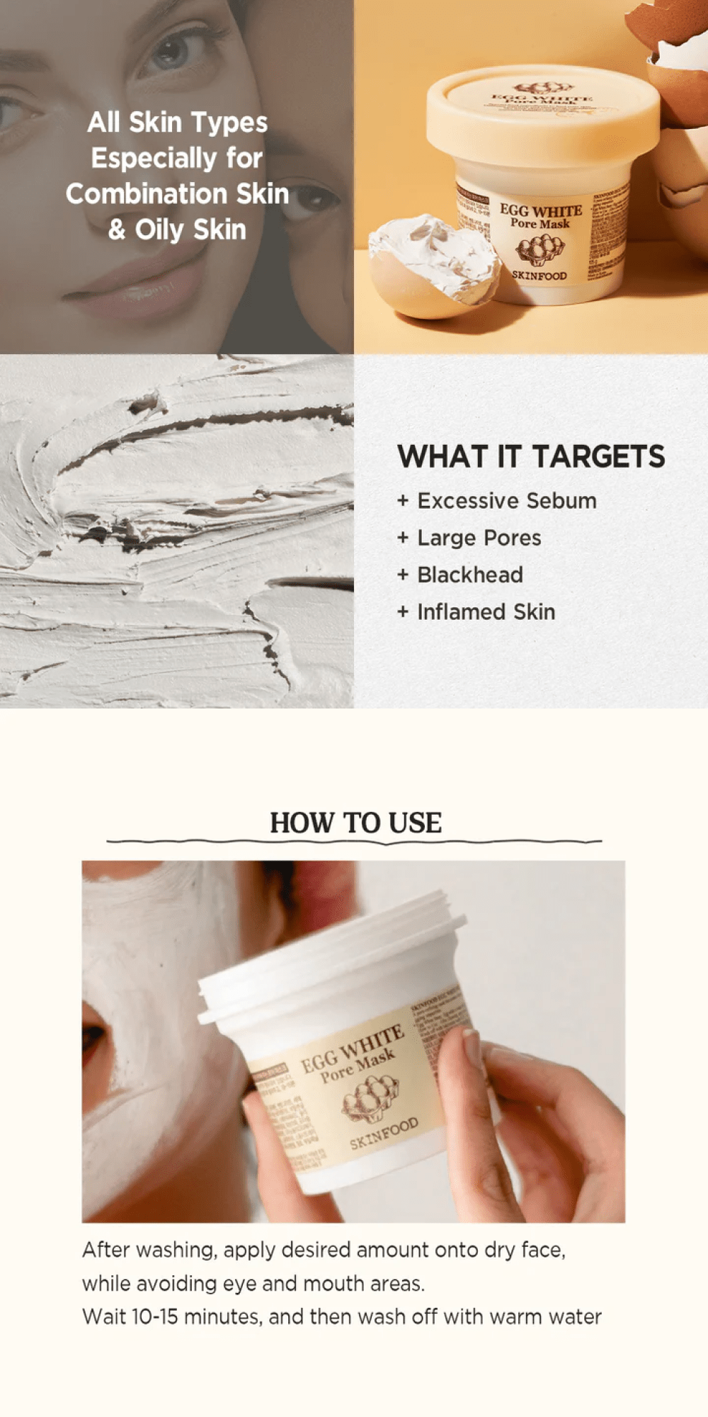 Purify and refine your skin with the SKINFOOD Egg White Pore Mask, a wash-off mask designed to target clogged pores and uneven texture. Enriched with natural egg white extract, this mask works to absorb excess sebum, lift away impurities, and tighten the look of enlarged pores — leaving skin smooth, fresh, and balanced.