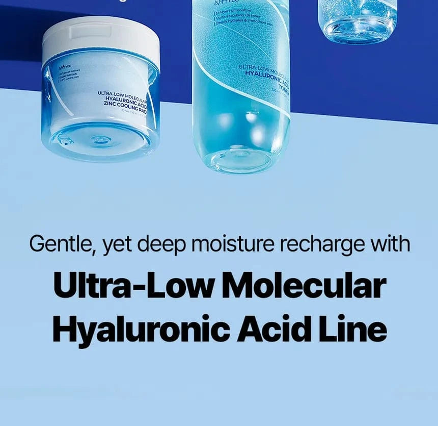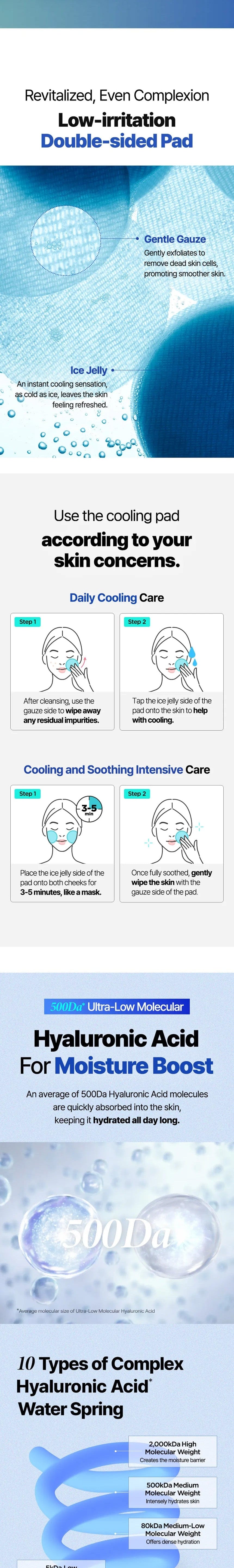 Instant cooling care in one swipe. These refreshing pads combine ultra-low molecular hyaluronic acid for deep hydration with zinc to soothe and calm the skin. Perfect for tired, heated, or sensitive skin—leaving it cool, smooth, and moisturized.