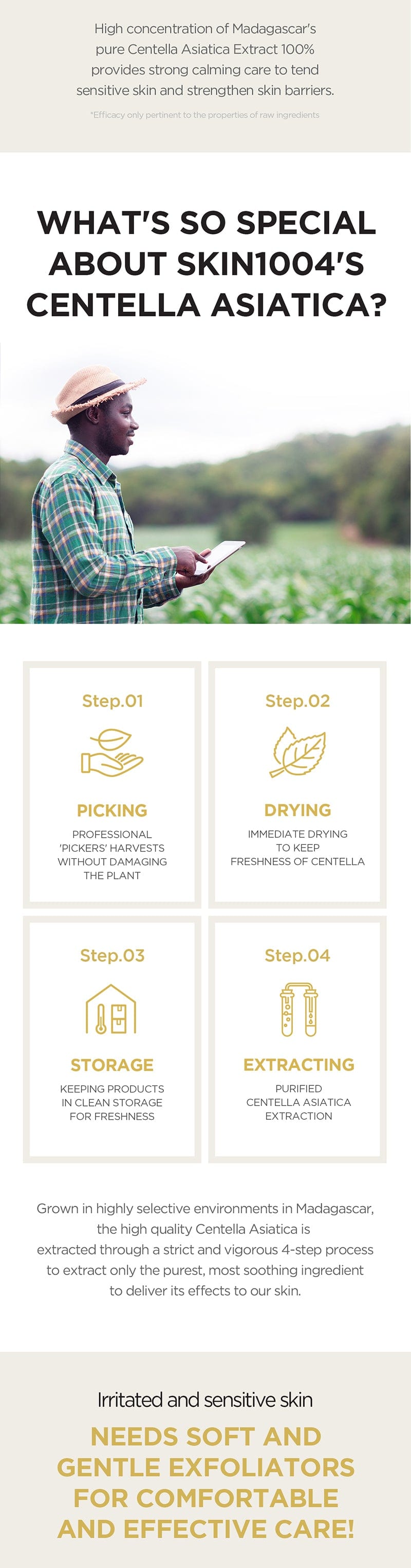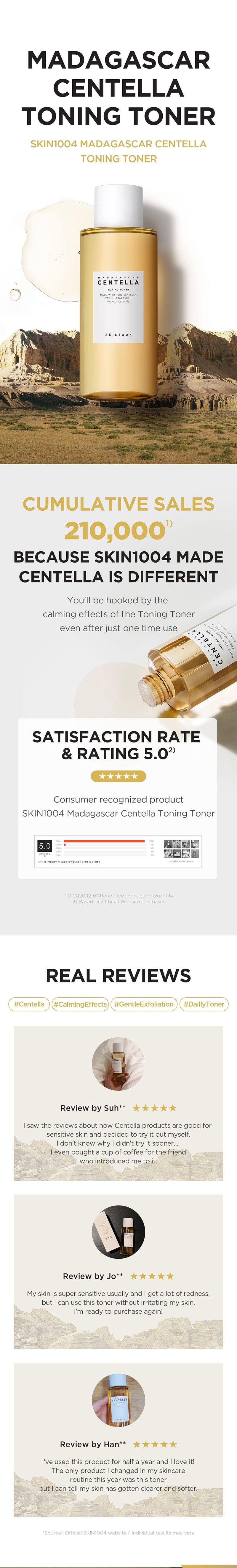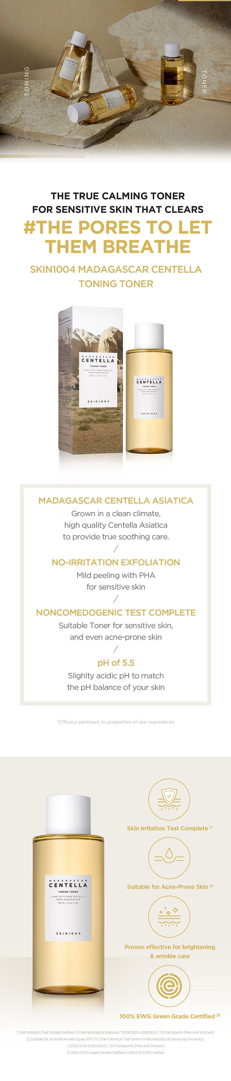 Exfoliate and soothe in one step with SKIN1004 Madagascar Centella Toning Toner. Formulated with Centella Asiatica extract from Madagascar to calm irritation and strengthen the skin barrier, this gentle toner also contains PHA to remove dead skin cells and refine skin texture without causing dryness or sensitivity.