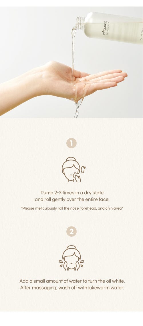 Dispense 2–3 pumps onto dry hands and gently massage over dry face, focusing on areas with heavy makeup. Add a small amount of lukewarm water to emulsify, then rinse thoroughly. Follow with your favorite water-based cleanser for a complete double cleanse.